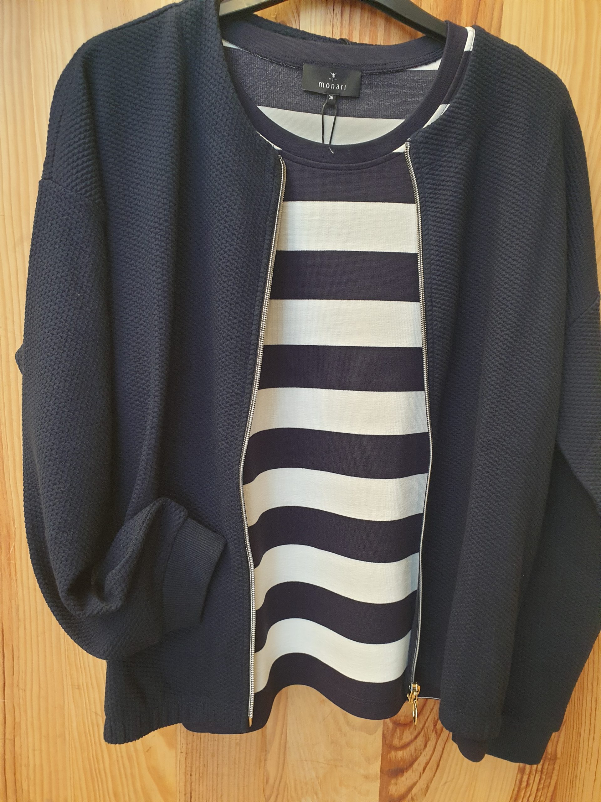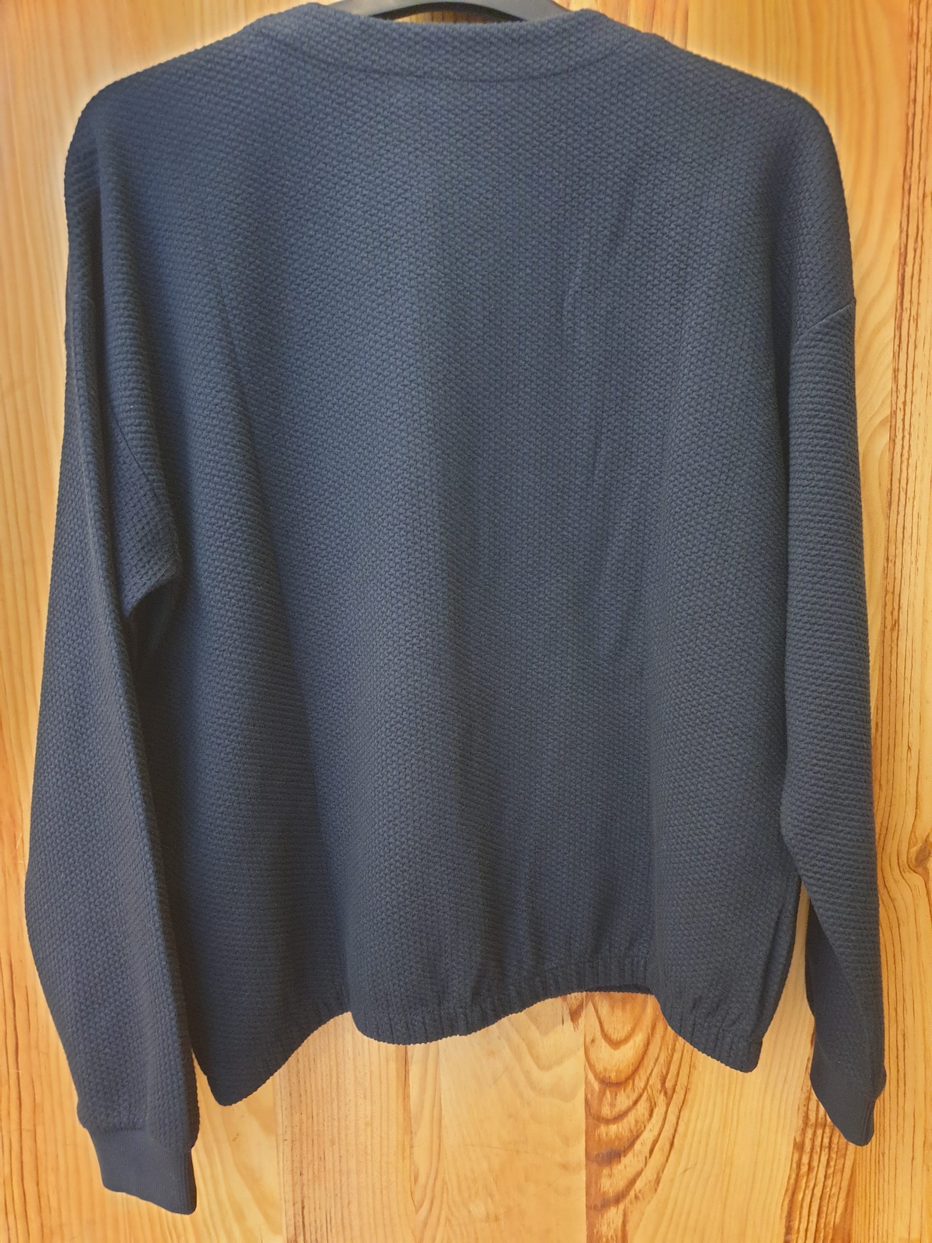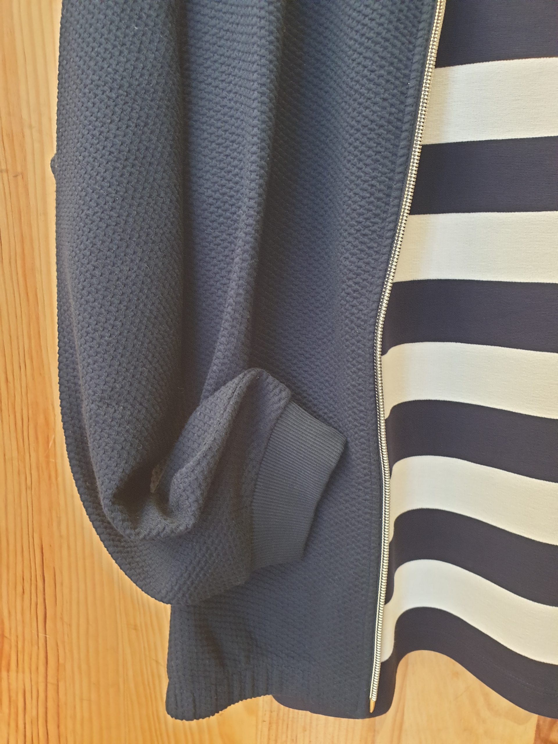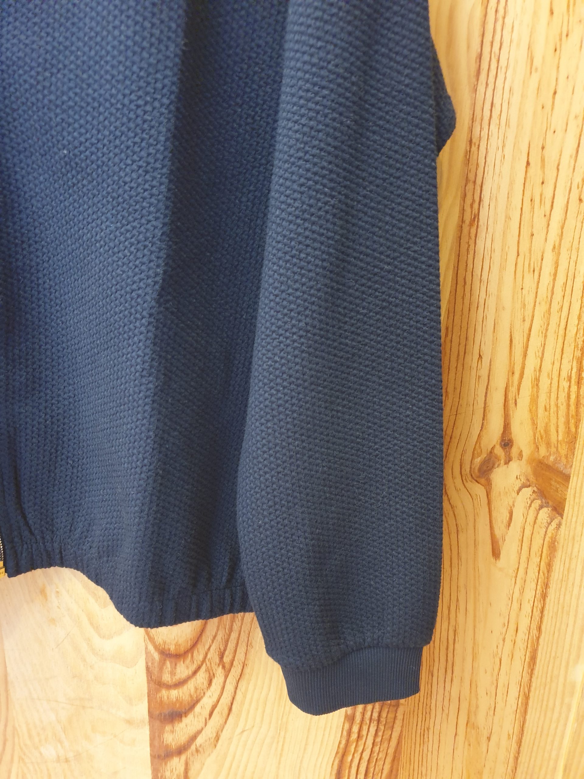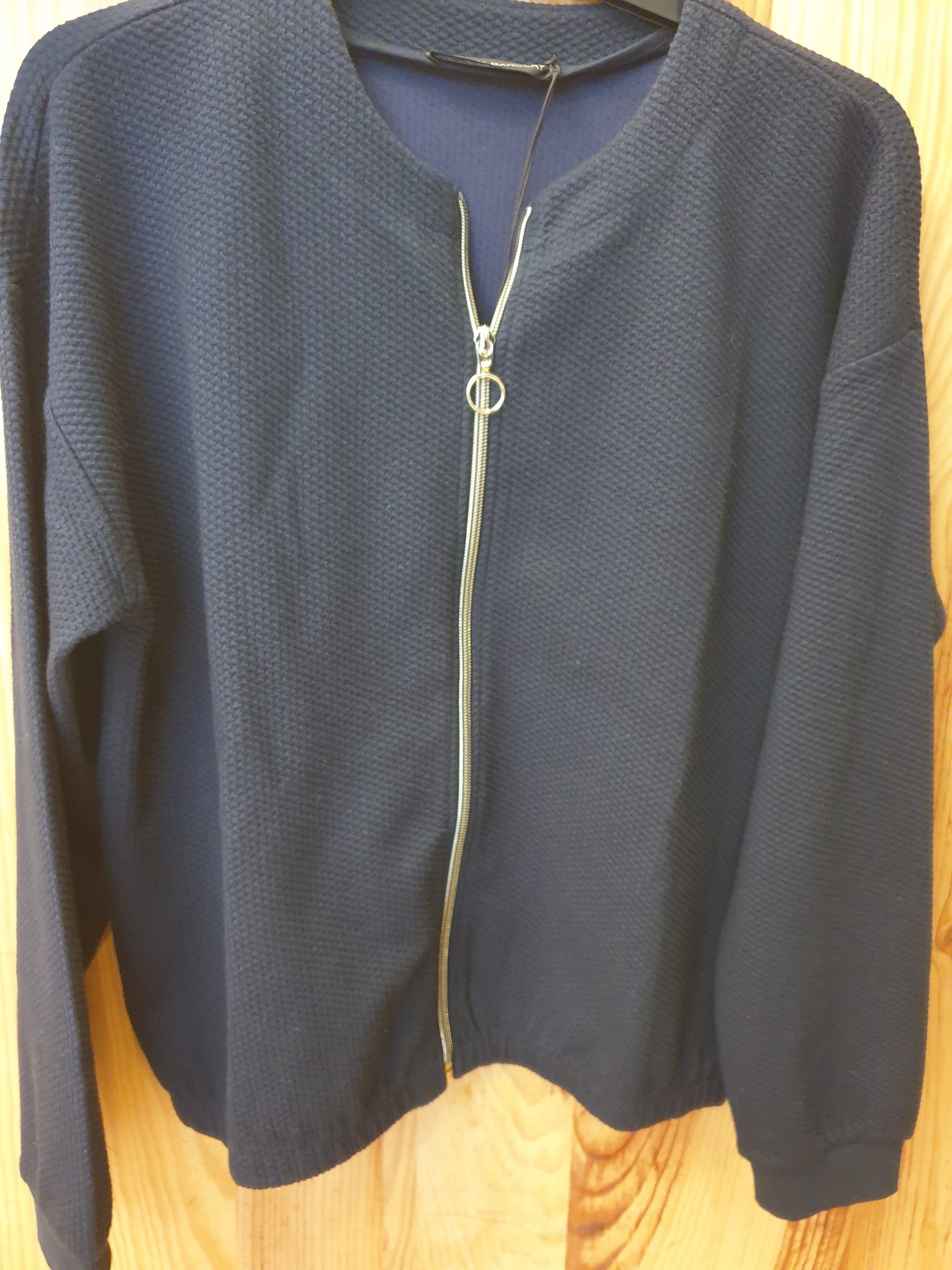 Blouson zippé, court, encolure ronde, manches qui se resserent, poches côtés, légèrement resséré en bas, tissu souple légèrement gauffrée.