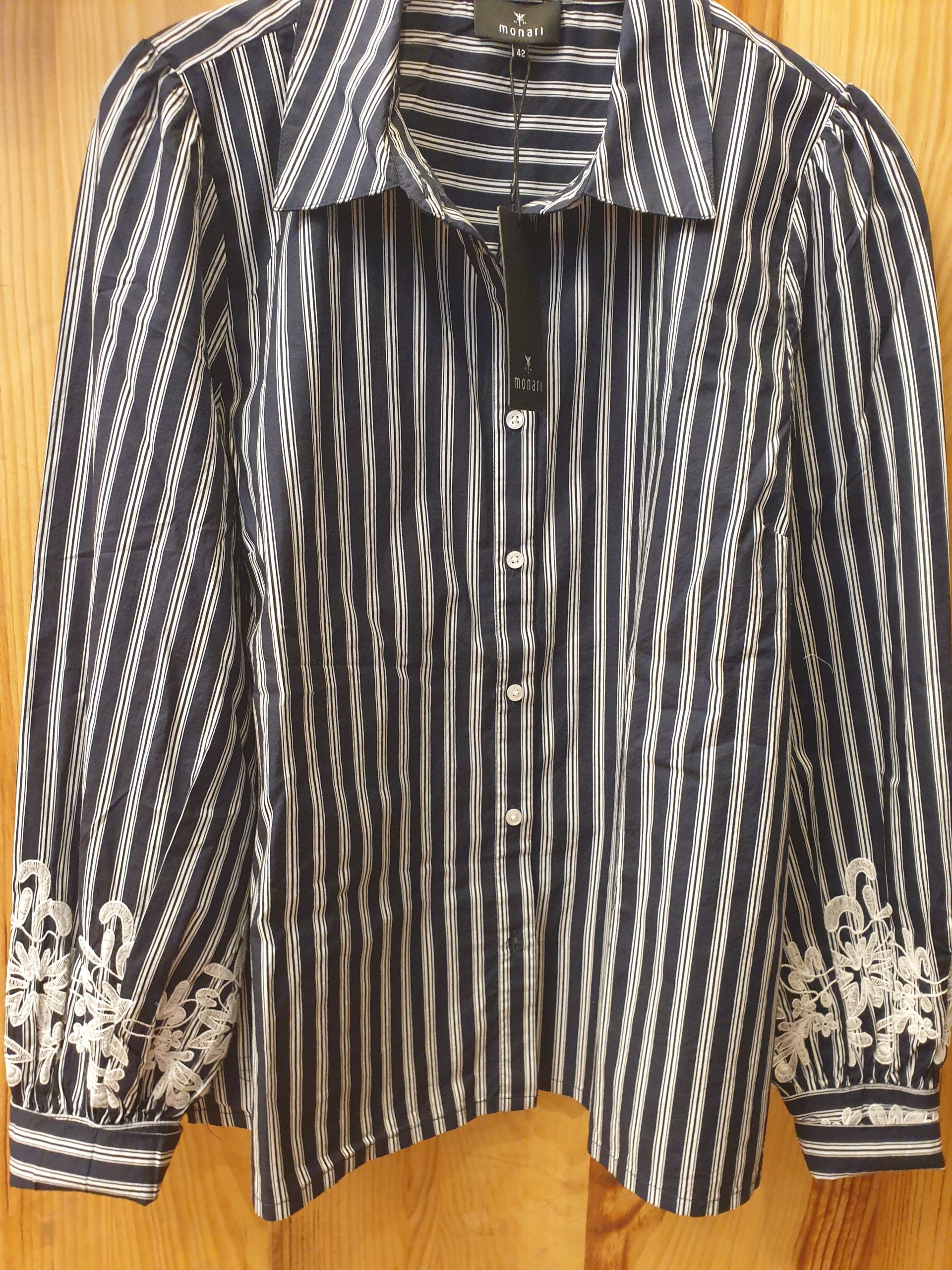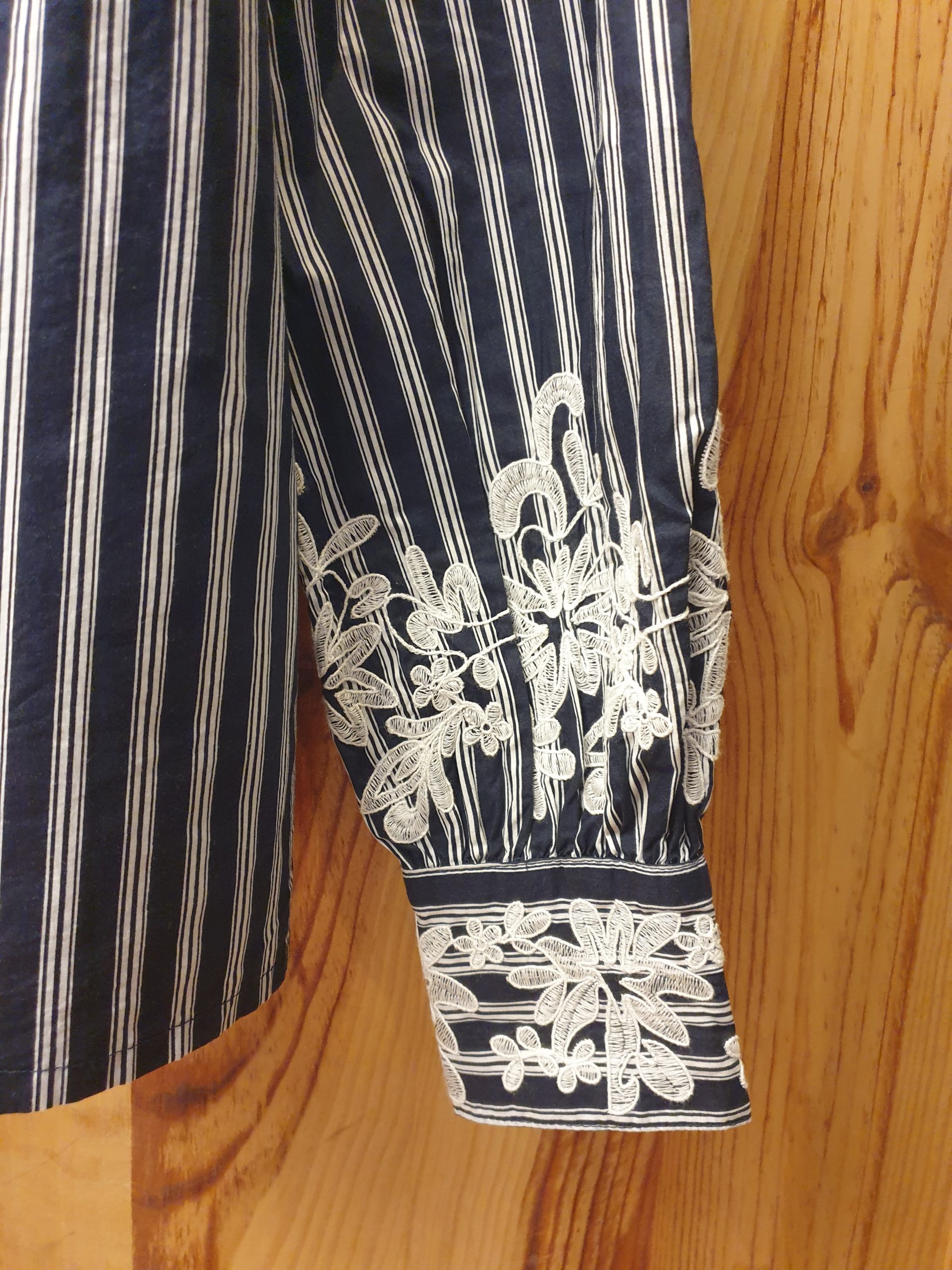 Chemise rayée, manches longues bouffantes avec broderies au poignet. Couleur unique : rayures navy blanc et broderie blanche