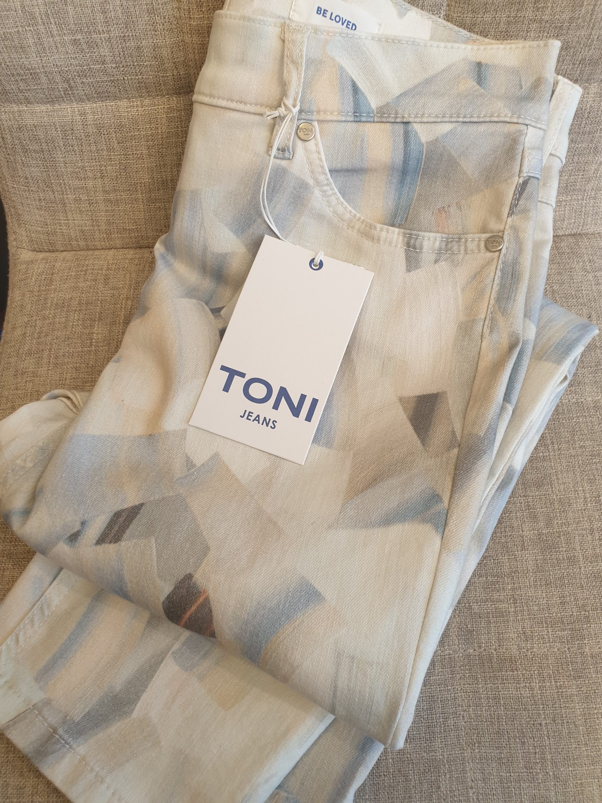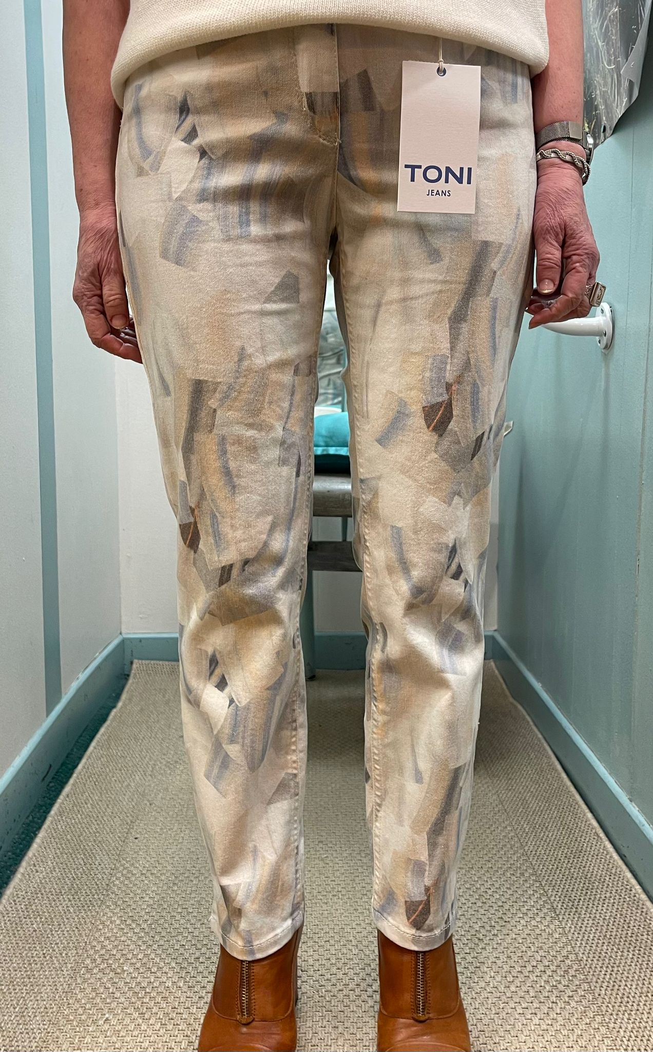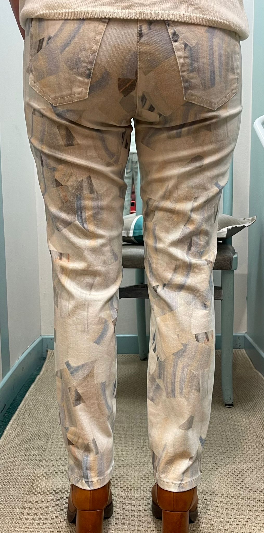 Pantalon, 7/8, coupe BE LOVED, droite en tissu imprimé graphique, couleur pastel.