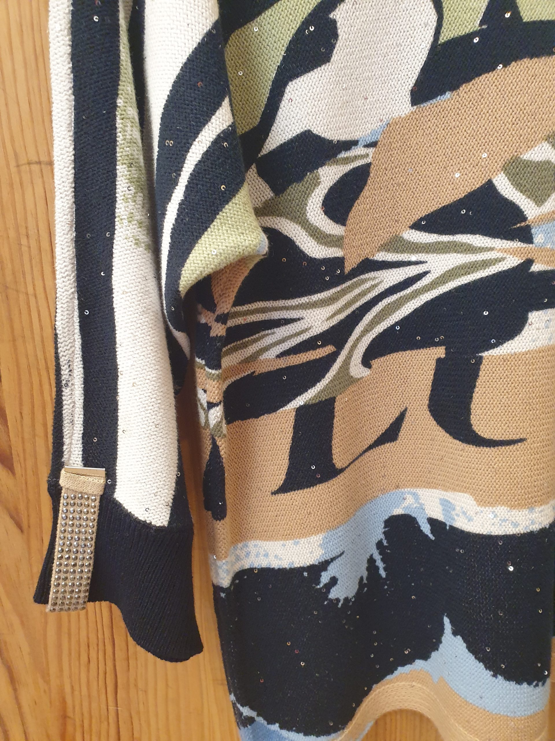 Pull imprimé graphique, manches 3/4, jeu de patte sur manche.