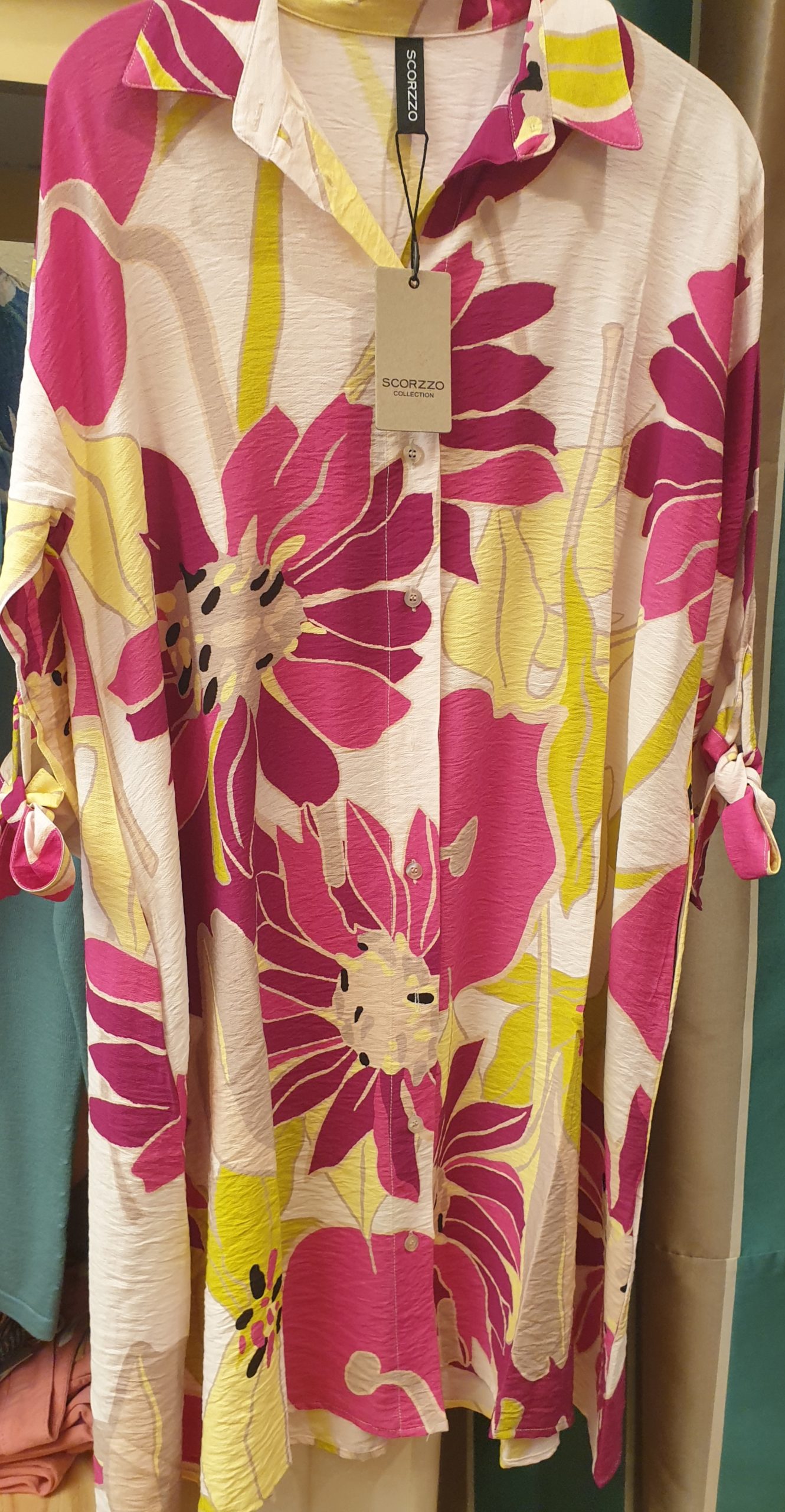Robe boutonnée, oversize, spéciale grande chaleur, avec col, manches 3/4 qui se remontent avec un noeud, peut se mettre comme dessus de maillot de bain .