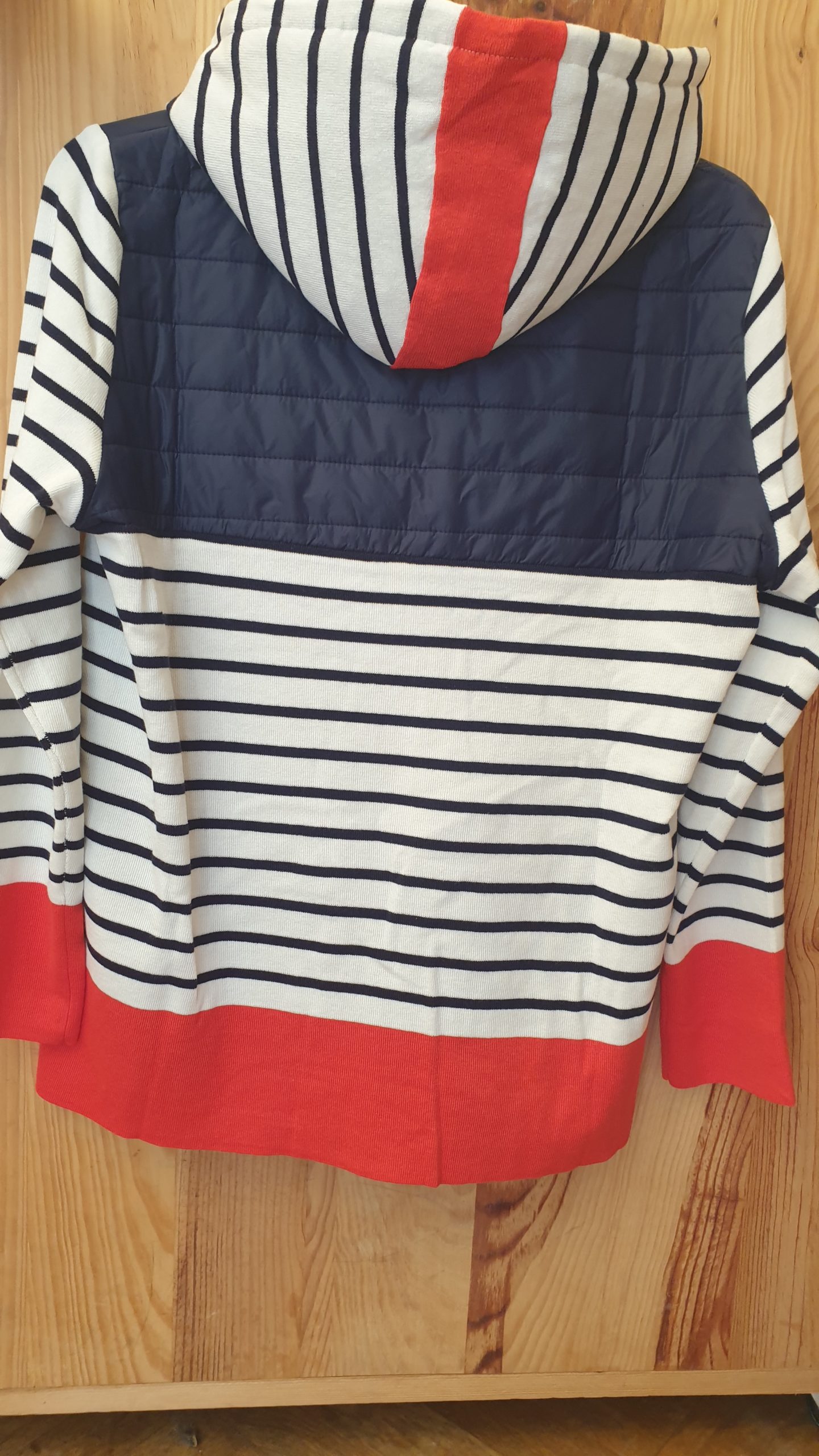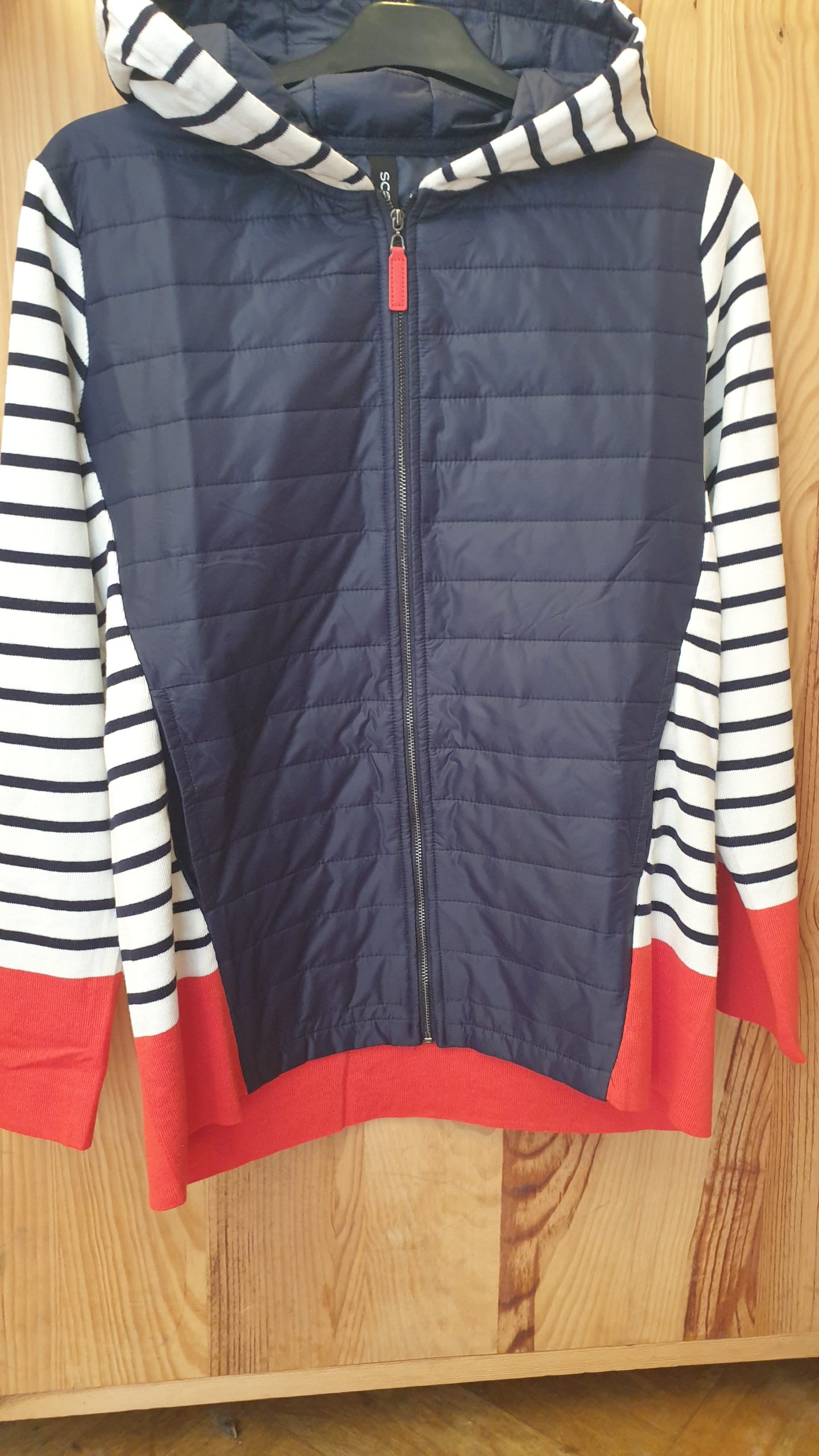 Veste avec capuche, manches longues, fermeture avec un zip, jeu de bi-matière, maille et doudoune. esprit croisière